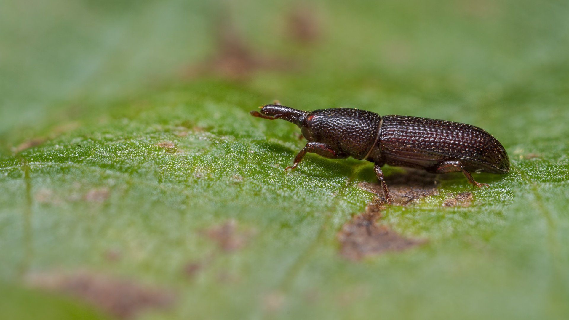The Weevils are a large class of Beetles, having distinct snouts, from which spring the antennae or feelers. There are two species of Weevil which are found in structural timbers-Pentarthrum huttoni and Euophryum confine; they have no popular names. They are small, dark brown or black beetles, about 1/8 inch in length, and are easily distinguished by their pronounced snouts.