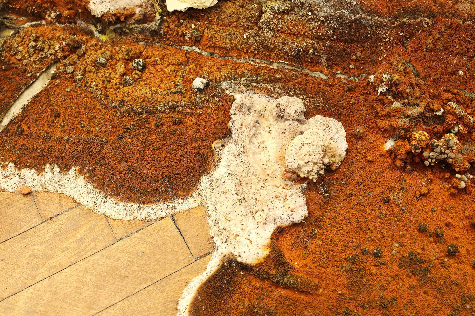 When the fungus has reached a certain stage of maturity, the fruit bodies are produced. These are generally in the form of flat pancakes, growing on the wood or on brickwork and plaster near it. The fruit bodies have brick-red centres with white edges tinged with lilac. They are sometimes several square feet in area and give off prodigious numbers of spores-2,000,000 a minute from each square foot for several days. It can generally be assumed that where fruit bodies are present, the attack is of long standing.